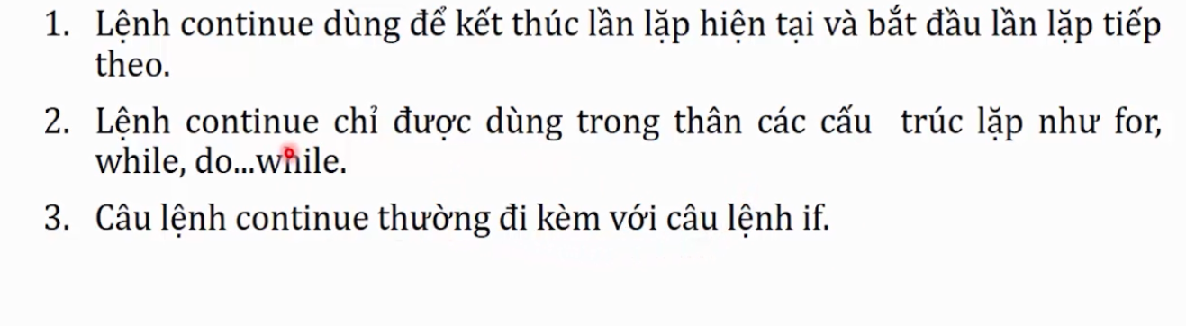 - khi break được thực hiện bên trong 1 cấu trúc lặp ,điều khiển tự lộng nhảy đến lệnh đầu tiên ngay sau cấu trúc lặp đó